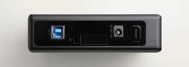 裏面は、USB 3.o Type-Bコネクター(5Gbps)、電源入力、電源スイッチだけのシンプル構成です。