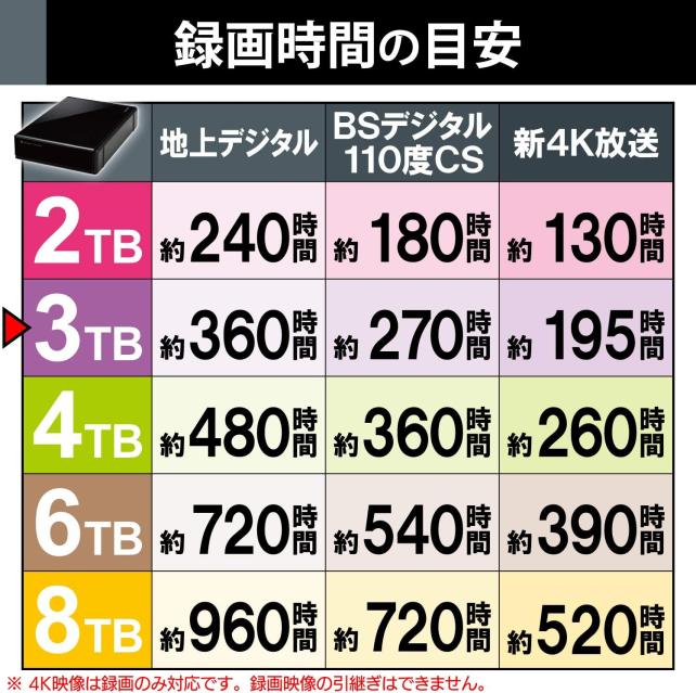 私が使用している、Panasonic製ブルーレイレコーダーでは、認識可能な外付けHDDの最大容量が4TBなので、4TBのHDDを購入しました。