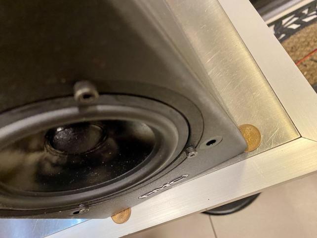 ステンレス板を貼ったテーブルに直置きした時、コインで三点支持を施した時