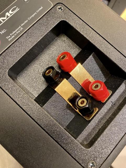 バイワイヤリング対応の端子。 金メッキされたジャンパーは標準品。 バナナプラグ対応。