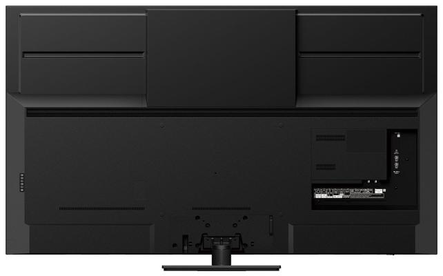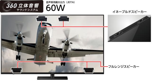 テレビ背面には、画面底部に向けて、左右にフルレンジスピーカーが付いていて、更に天面近くに、イネーブルドスピーカーが付いていて、天井に向けて音を出し、天井で音を反射させることで、音源が天井にあるような錯覚を作り出し、立体音響を実現しているようです。
