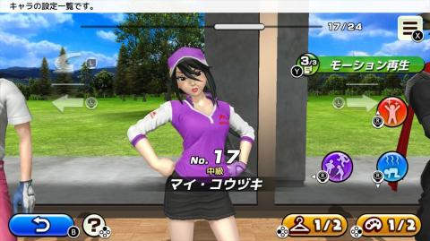 一瞬、この中から好きなキャラを選んで、ハーフラウンドするんだな、と思って選択し始めると、1ホールに設定したキャラは、他のホールに設定出来ない事に気付き、ゲーム紹介ページに戻って、上記の仕様を知らされました。
