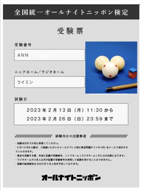 受験者には 自分のラジオネームと受験番号入りの受験票が データとして配布されました。