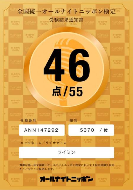 5370位 55点満点中の46点が平均点に達しているのか どうかは判りません。
