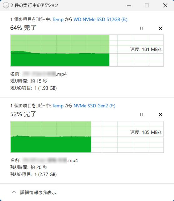 2本のSSDに同時にコピーを始めると、共に180MB/sオーバーの転送速度でした。