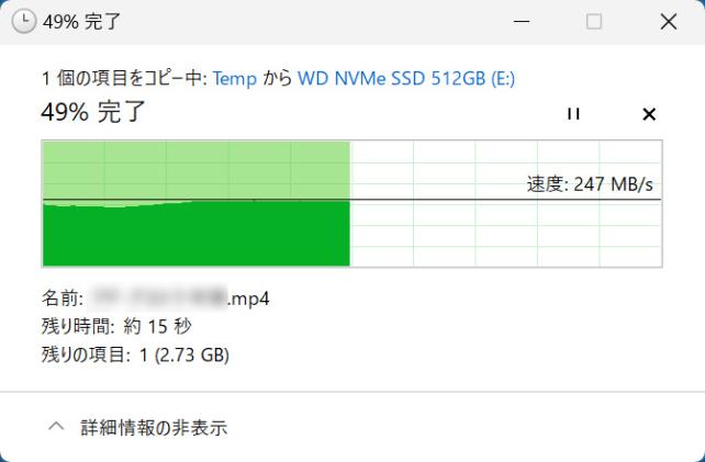 試しに、10Gbps対応のUSB SSDをUSB 2基の3.0ポートに同時に挿して、大きなサイズの動画ファイルをノートPCのSSDからコピーしてみました。