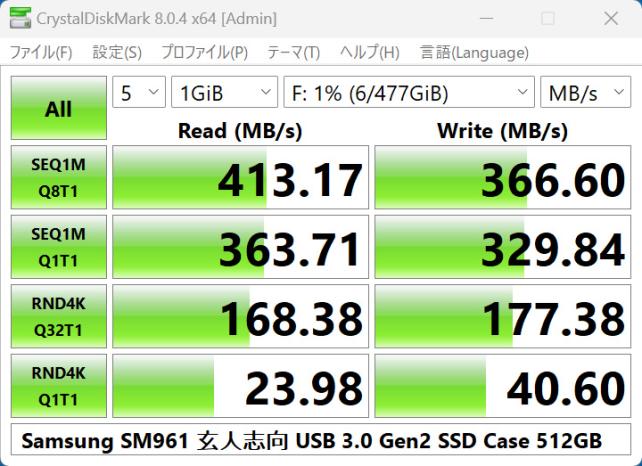 試しに、DiskMarkを走らせてみると、本商品の説明通り、転送速度5Gbpsの説明通り、400MB/s以上の速度がでました。