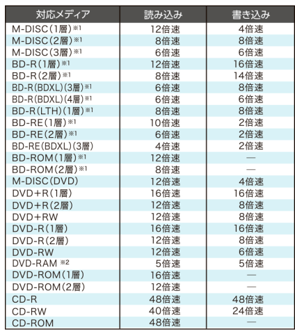 対応メディアと最大速度は以下の通り(製品サイトより引用)です。この対応メディアの中で、昔は無かったものとしては「M-DISC」というのがありますね。扱ったことはありませんが、耐光性、耐熱性、耐湿性に優れており、長期の読み出しが可能らしいので、機会があったら使ってみたいと思っています。