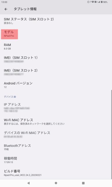 タブレットの設定画面から、タブレット情報をみても、ちゃんとNPad Proと表示されます。