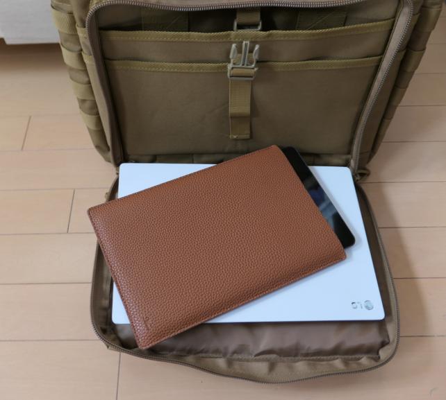 表面の大きな収納には、奥のポケットにケースに入れたタブレット、手前の2つに分けられた収納にスマートフォン2台。