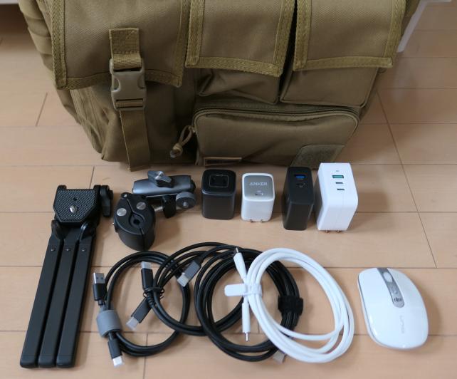 更に、表面にある小さな収納4つには、小型三脚、グリップ、USB充電器4個、USBケーブル4本、ワイヤレスマウスを収納することができました。