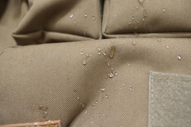 最後に、このバッグは、オックスフォード900DDPVCの生地を使っていて、耐摩耗性が高いとのことで、合わせて防水加工が施されているとのことだったので、水を垂らしてみました。