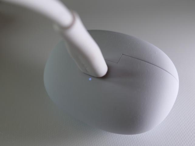 ケースにイヤフォンをセットして充電ケーブルを挿すと、充電中は、白LEDの点滅が始まり、充電完了で点灯に変わります。