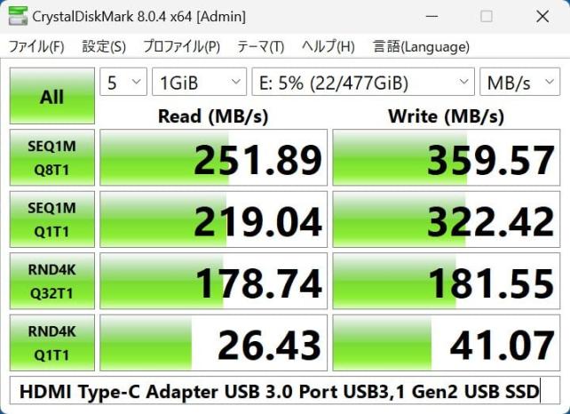 また、HDMI Type-CアダプターのUSB Type-Aポートに、USB SSDを接続して、DiskMarkを走らせてみました。
