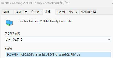 認識されたデバイスを見ると「Vendor ID 10EC 、Device ID 8125」だった。