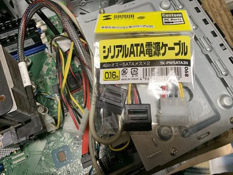 そこでAmazonで探してみると、4pinをSATA電源×2に変換するTK-PWSATA3Nが見つかり、即注文を入れたわけです。