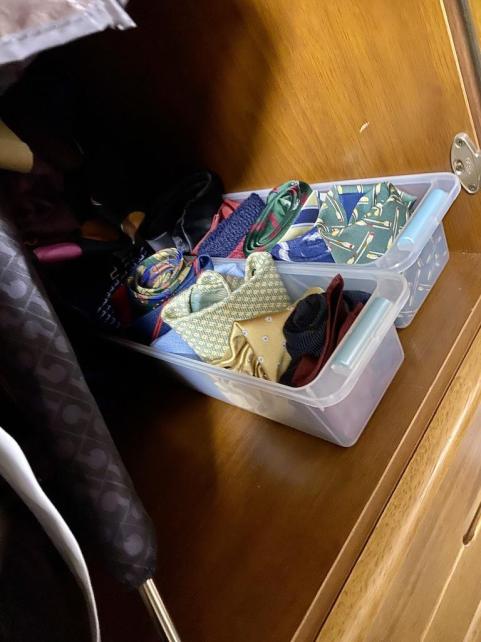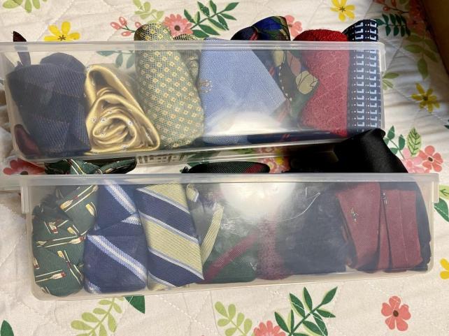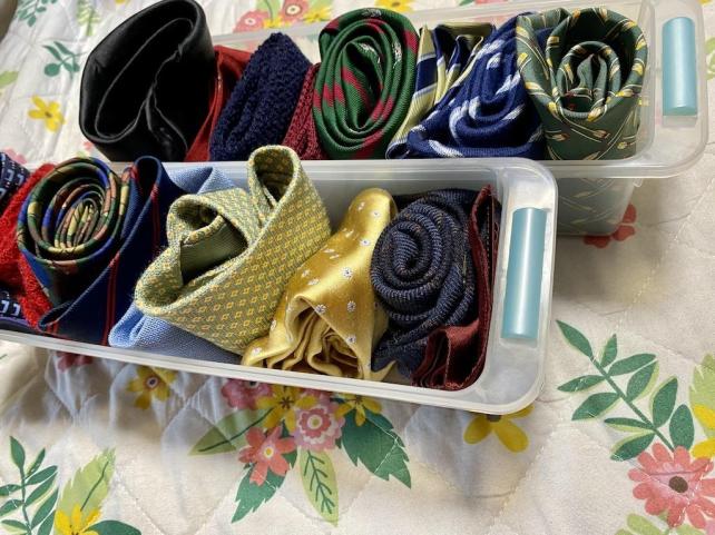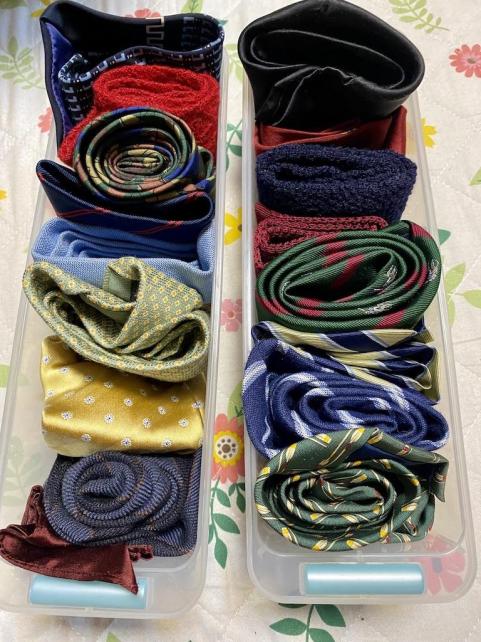 ネクタイやチーフ 適度な大きさに丸めて、スリムストッカーに並べております。