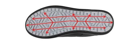 「SOFPON」は、つま先から踵方向と斜め方向にかけて、水や油が流れ出やすくするための溝を配置しているそうで、その溝が水や油のはけをよくして、滑りにくくしています。