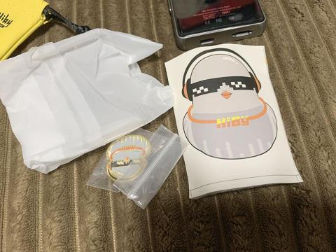 巾着の中身はよくわからないオリジナルキャラクターのグッズや、シェルカバーでした。
