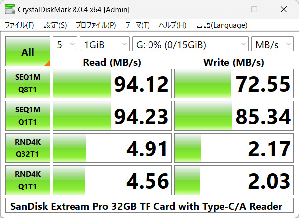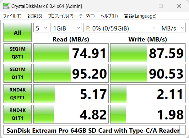 試しに、SanDisk Extream Proの64GB(SD Card)と32GB(micro SD Card)を同時に挿して、各々DiskMarkを走らせて、読み書き速度を計測してみました。