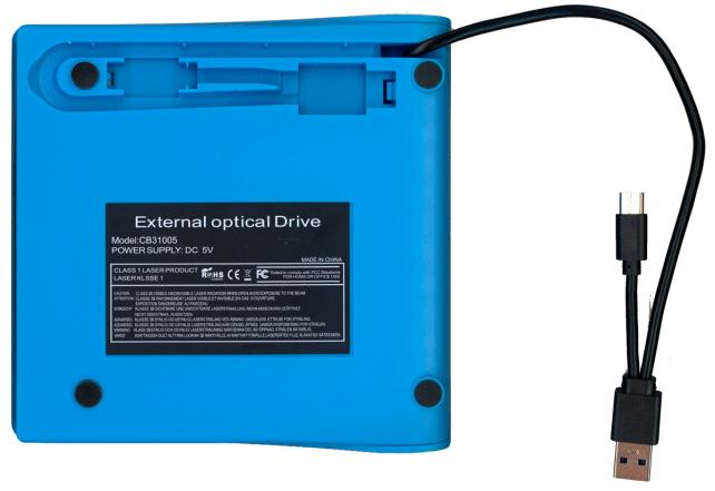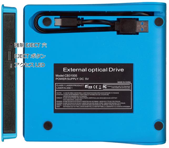 本体の底面には、USB 3.0 Type-AコネクターとUSB Type-Cコネクターが、1本のUSBケーブルに付けられていて、この光学ドライブは、Type-A,Type-C何れのUSB ポートにも接続することができます。