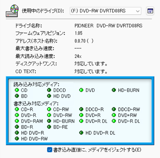 ディスクのライティングソフトウェアで、DVDドライブの詳細を見てみると、DVD-RWドライブは、パイオニア製のDVD-RWドライブで、DVRTD08RSという型番のドライブでした。