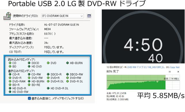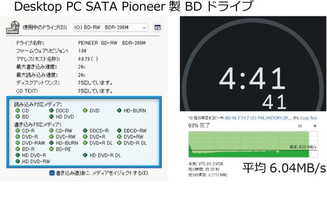 また、別のUSB2.0のインターフェイスを備えたLG製DVD-RWドライブと、デスクトップPCに付いている、SATA接続のBDドライブでも同様の計億をしてみました。