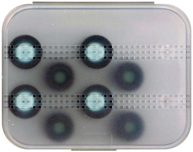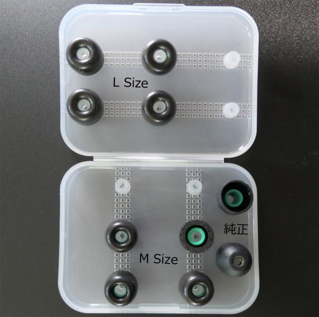 中には、半透明のプラスティックケースに、上面(上蓋)にLサイズのイヤーピースが2ペア、下面にMサイズのイヤーピースが2ペア入っていて、上面/下面共に、あと1ペアが固定できる突起があります。