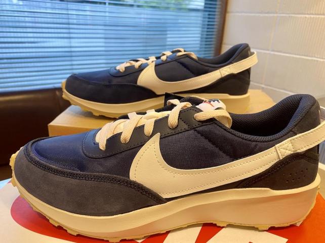 濃紺のバックスキンと通気性のあるファブリック 白いソールサイド ベージュのワッフルソール