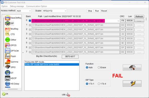「RTDTool.exe」というものでファームウェアアップデートができるということで、メールで頂いた手順通りに試しましたが失敗のFAILとなりました。