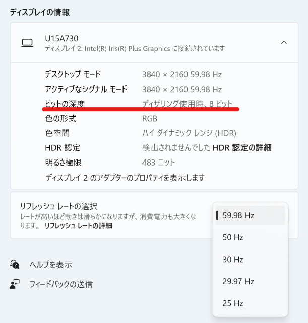 しかし、DisplayPort Alternate Modeで接続するとディザリング使用時 8ビットになりました。