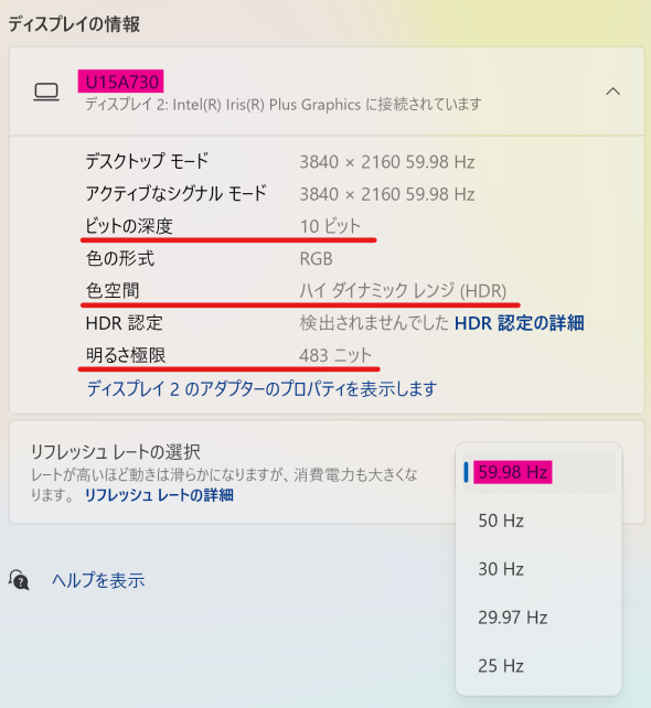 消費電力を抑えたい場合には、リフレッシュレートを落とすのもありですね。