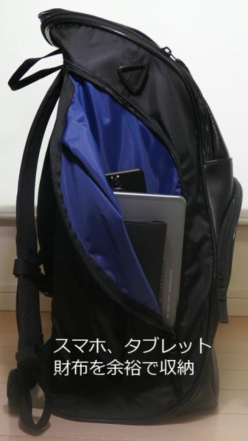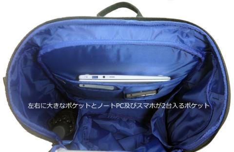 その他の収納では、メインの収納に、ノートPCが入れられる比較的大きなものや、折り畳み傘や水筒等が入れられる長尺物が左右端に収納できたり、タブレットやスマホが入れられる小型のポケット等があったりします。