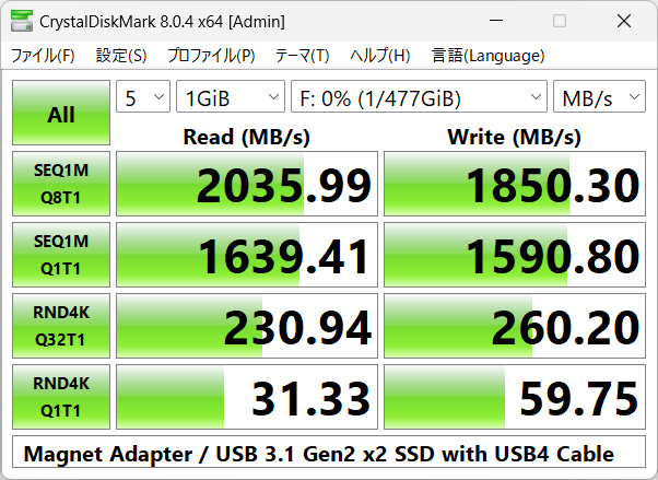 次に、このアダプターを、USB4ケーブルの両端に挿して、USB 3.1 Gen2 x2ポートにUSB 3.1 Ge2 x2 ポータブルSSDを接続して、DiskMarkを走らせてみました。