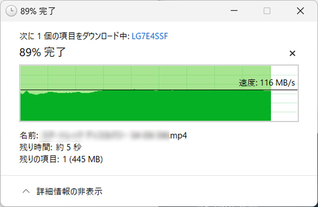 試しに、4GB程度の動画ファイルを転送してみたのですが、116MB/s程度で転送できました。