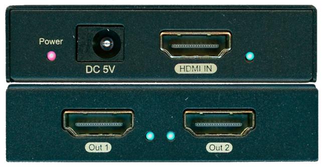 入力面の反対側には、2分配された、HDMI出力が2系統あり、各々のインジケータとして青のLEDが付いています。
