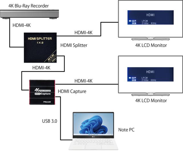 私の場合、4K映像を、モニターに表示しつつ、PC用HDMIキャプチャーユニットでPCに動画をキャプチャーしながら、HDMIキャプチャーユニットに備わっている4Kパススルー機能を用いて、別の4Kモニターに表示します。
