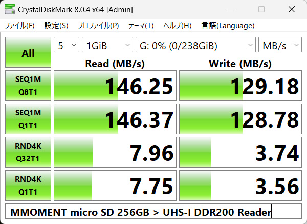 UHS-I DDR200対応のカードリーダーで、DiskMarkを走らせると、シーケンシャルリード 150MB/s弱、シーケンシャルライト130MB/s弱という値が表示されました。