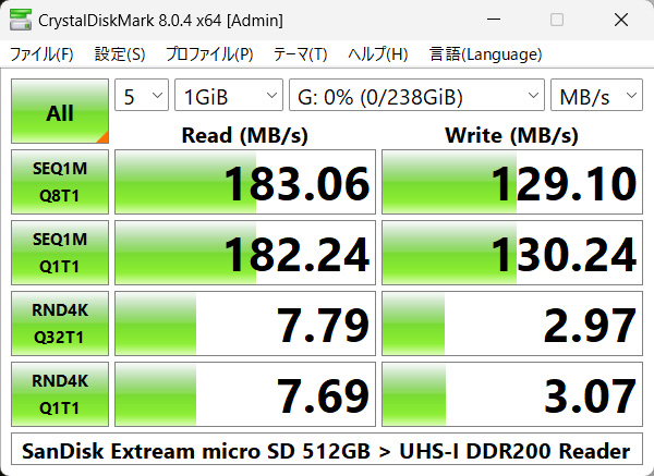 早速、先日購入したSanDisk Extrean micro SD 512GBでDiskMarkを走らせてみました。