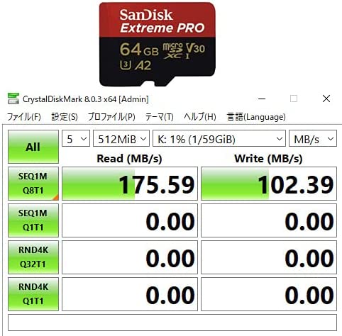 また、この商品の紹介ページの画像の中に、SanDisk Extream Pro micro SD 64GBのDiskMarkのシーケンシャルリード/ライトのみ計測した画像があり、シーケンシャルリードで、175.59MB/s,シーケンシャルライトで、102.39MB/sのデータを見つけました。
