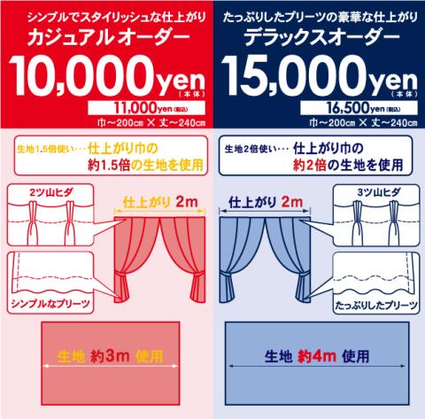 ・生地の量の選択:仕上がり2mのカーテンを造る際に、生地3mか4mかを選択する。