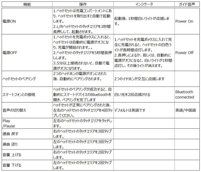 この表の項目以外に、音声アシスタント(googleやsiri)呼び出しや、電話の受話/終了/拒否、バッテリー残量警告、充電時の充電ボックスの動作等が記載されています。