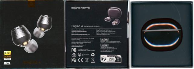表面には、金色でSoundpeatsのロゴマーク、商品本体写真、同じく金でENGINE4のロゴ、HiRes AUDIOのマーク及びLDACのマークが付いています。