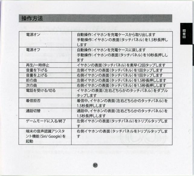 タッチコントロールの仕様は、一般的で、PLAY/PAUSE、音量制御、選曲、着信 通話・終話、着信拒否、ゲームモード、端末の音声アシスタント呼び出しができます。