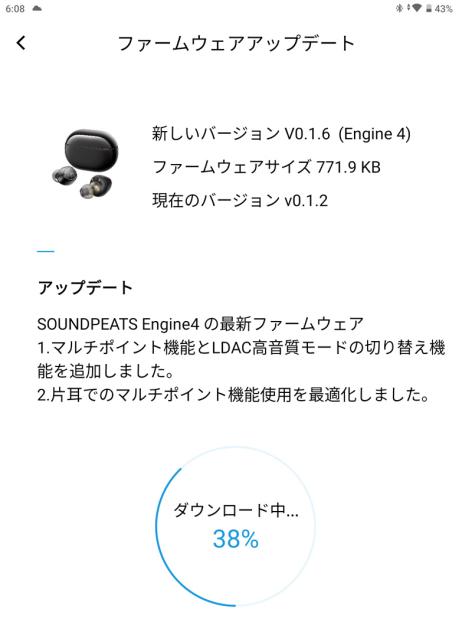 登録が終わり、イヤフォンと接続が確認されると、イヤフォンのファームウェアのアップデートの案内がありました。