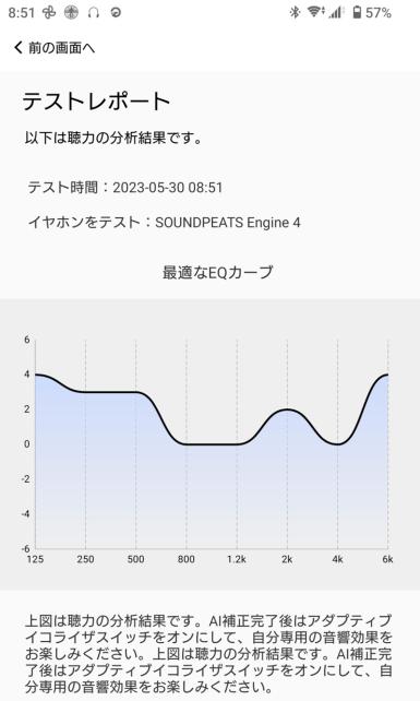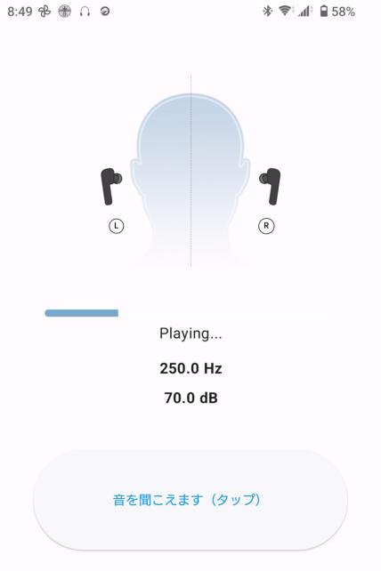 アプリケーションでは、アダプティブイコライザーという自分の聴力に合わせたイコライザーの設定ができる聴力補正機能があり、各周波数のトーン信号が聞こえた時点で、スマートフォンのボタンを押すことで、自動的に計測されます。