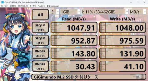 実際にPCに繋いで、CrystalDiskMarkを使って速度を測りました。