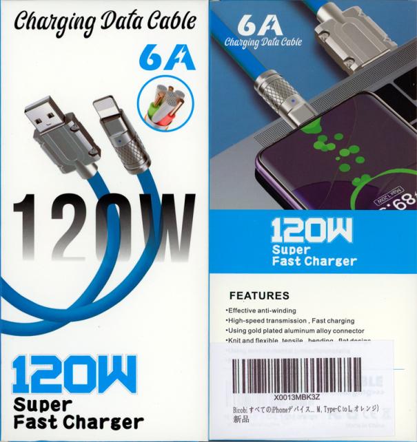 パッケージは青色を基調としたパッケージで、Charging Data Cable、6A,120W Super Fast Chargerという文字が記載されています。