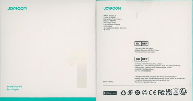 パッケージ内容は、スマートフォンホルダー部分と、自転車やバイクのハンドルに固定できるクランプ、取扱説明書が同梱されていました。