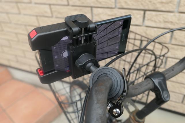 早速ママチャリに付けてみましたが、ハンドルへの固定もシッカリでき、スマートフォンのホルダー部分もスマートフォンをしっかり挟んでくれて、メーカーが想定した方向と逆向きの固定方法ですが、スマートフォンがずり落ちる心配は微塵もありません。